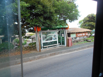 Dalam bas perjalanan menuju ke Seogwipo City (tempat kami akan menginap), ahjushi driver tu pasang channel radio ala-ala Klasik Nasional FM. Memang layyan la lagu-lagu klasik Korea :D Selepas lebih 15 minit perjalanan, rupanya bas yang kami naik tu cuma bawa kami separuh perjalanan. Kami kena naik 1 bas lagi untuk ke Seogwipo city. Sebelum kami turun, ahjushi pemandu bas sempat berpesan pada seorang penumpang yang turun dengan kami supaya tolong bawa kami sampai Seogwipo sebab penumpang tu pun nak ke Seogwipo juga. Sangat bertanggungjawab driver tu, tak biarkan kami terkontang-kanting selepas turun bas :)
